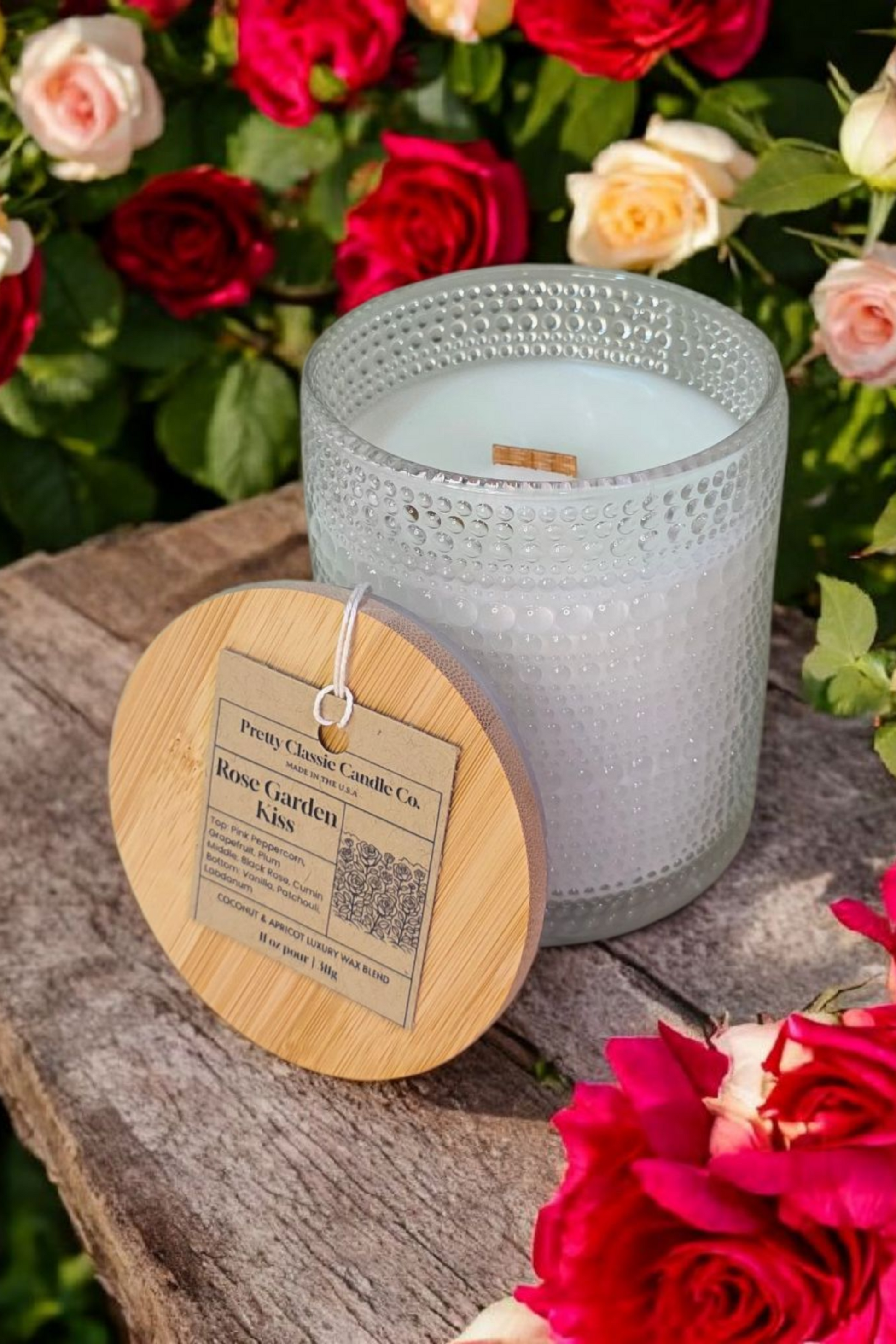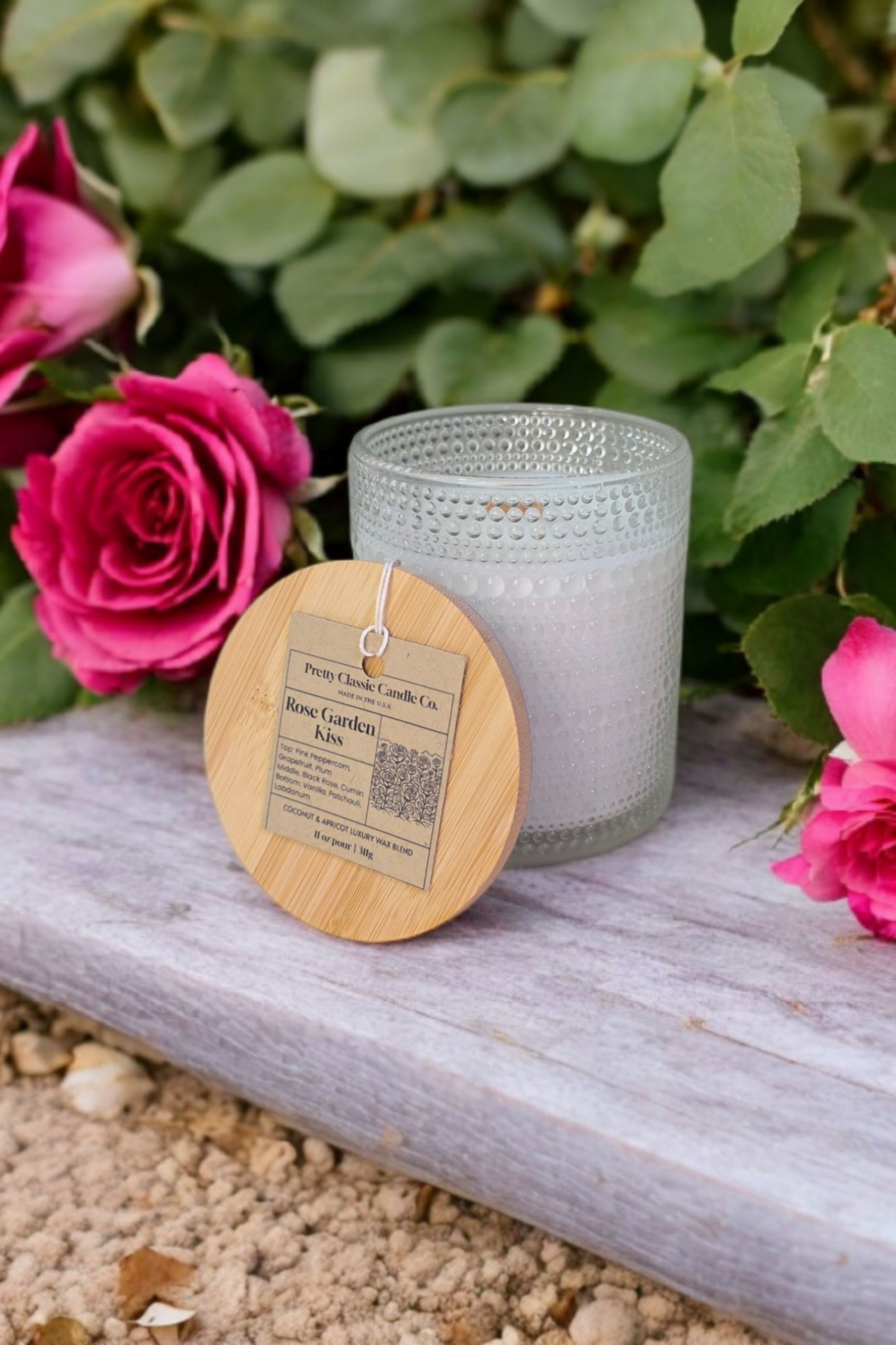 Rose Garden Kiss feels like a slow stroll through a blooming rose garden on a warm afternoon. Soft notes of pink peppercorn, grapefruit, and plum give it a fresh, airy start, while black rose and a touch of spice add warmth and depth. Creamy vanilla and patchouli round it out with a cozy, grounding finish. It’s floral, a little sweet, and beautifully calming just like fresh flowers and sunshine in candle form.